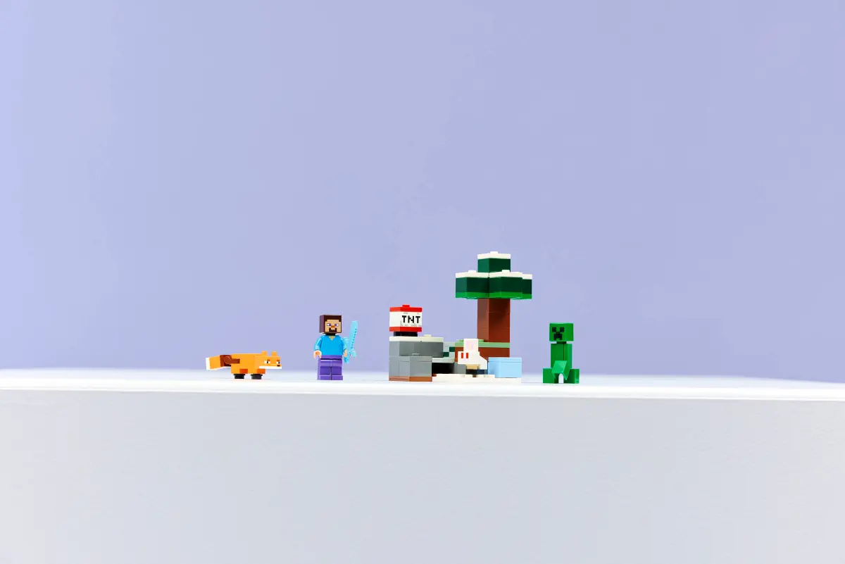 Copiii se alătură unuia dintre eroii jocurilor, Steve, pe când acesta extrage diamante în biomul taiga Minecraft, cu arborele său distinctiv de molid, zăpadă și vegetație de taiga. TNT-ul și o funcție de explozie desprind pietrele pentru a dezvălui diamantele, care pot fi depozitate într-un cufăr de comori. Setul include și un Creeper ostil de care să te aperi folosind sabia de diamant a lui Steve. Acest set este o idee grozavă de cadou pentru jucătorii Minecraft, constructorii LEGO și fanii decorațiunilor inspirate de universul gaming.