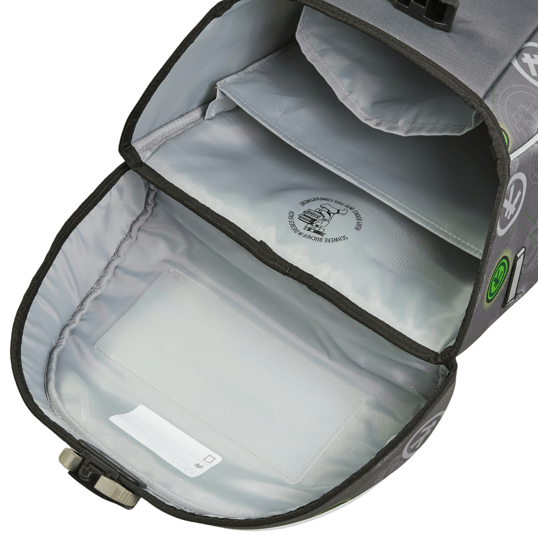 În compartimentul principal încăpător, poți atașa cheile sau portofelul LEGO, iar orarul școlii este amplasat practic în partea de sus a capacului. Rucsacul este prevăzut cu patru piciorușe sub bază, care îi oferă stabilitate și protecție împotriva murdăriei atunci când este așezat jos.