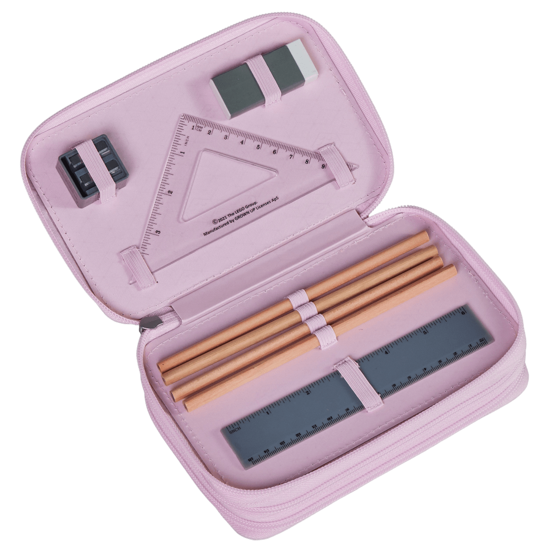 Acest penar conține toate rechizitele necesare pentru o zi la școală, conforme cu normele europene: 2 creioane, 10 creioane colorate, 4 creioane colorate groase, radieră, ascuțitoare, liniar și echer. Penarul are buzunar pentru inserat orarul și etichetă pentru nume. Fabricat din material rezistent, fără PVC, disponibil într-o gamă largă de modele inspirate din diversele universuri LEGO. Un penar care nu poate lipsi din primii ani de școală.