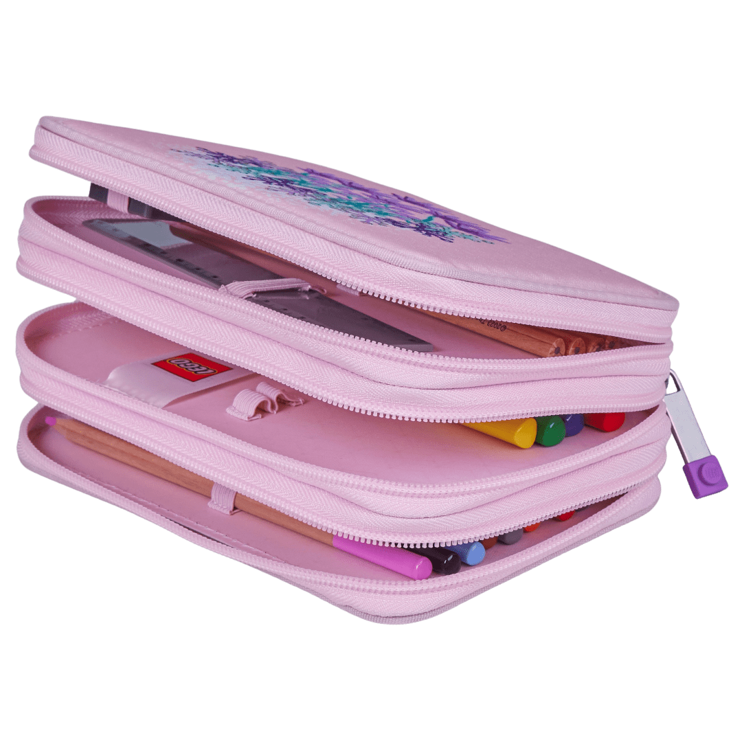 Acest penar conţine toate rechizitele necesare pentru o zi la şcoală, conforme cu normele europene: 2 creioane, 10 creioane colorate, 4 creioane colorate groase, radieră, ascuţitoare, liniar şi echer. Penarul are buzunar pentru inserat orarul şi etichetă pentru nume. Fabricat din material rezistent, fără PVC, disponibil într-o gamă largă de modele inspirate din diversele universuri LEGO. Un penar care nu poate lipsi din primii ani de şcoală.